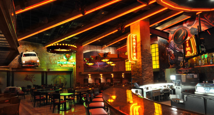 Multi-dimensional flames and Southwestern-style signage welcome customers to an entertaining dining experience. Rustic columns which flank the entrance are topped with illuminated fixtures. A life-size, bygone-era police car sits atop a platform high above the 180-degree bar.